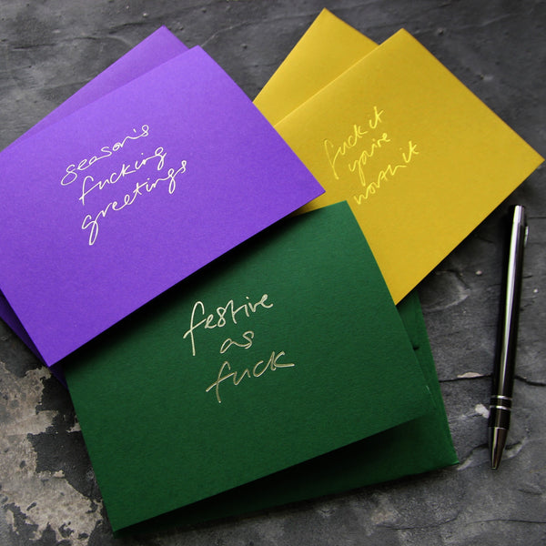 Text From A Friend is an award winning luxury cards and stationery brand. Our designs are inspired by texts, written by hand, then hand foiled and hand finished using a traditional press and sustainable materials. Some have anti-social messages. Some don't. Take your pick.